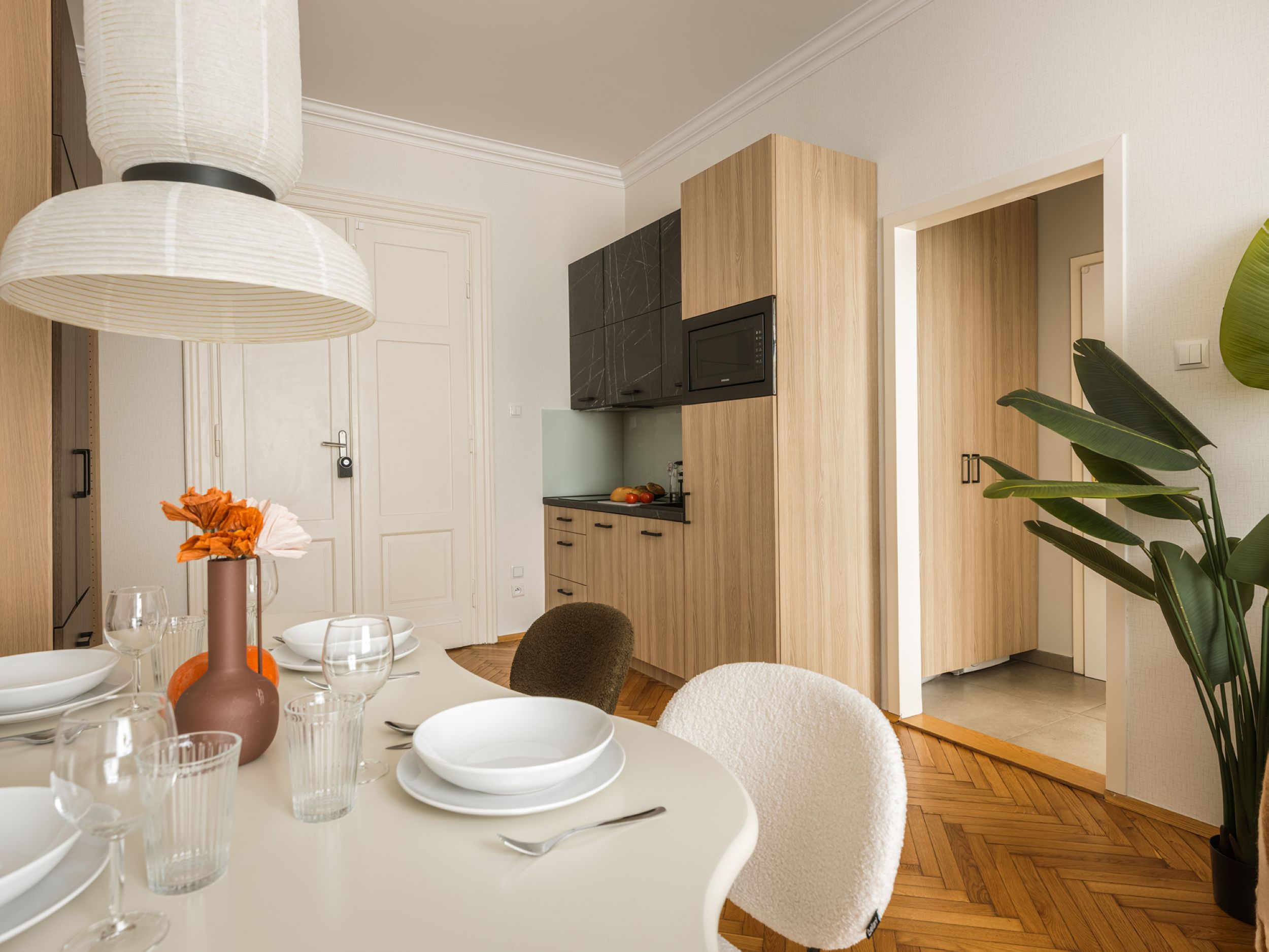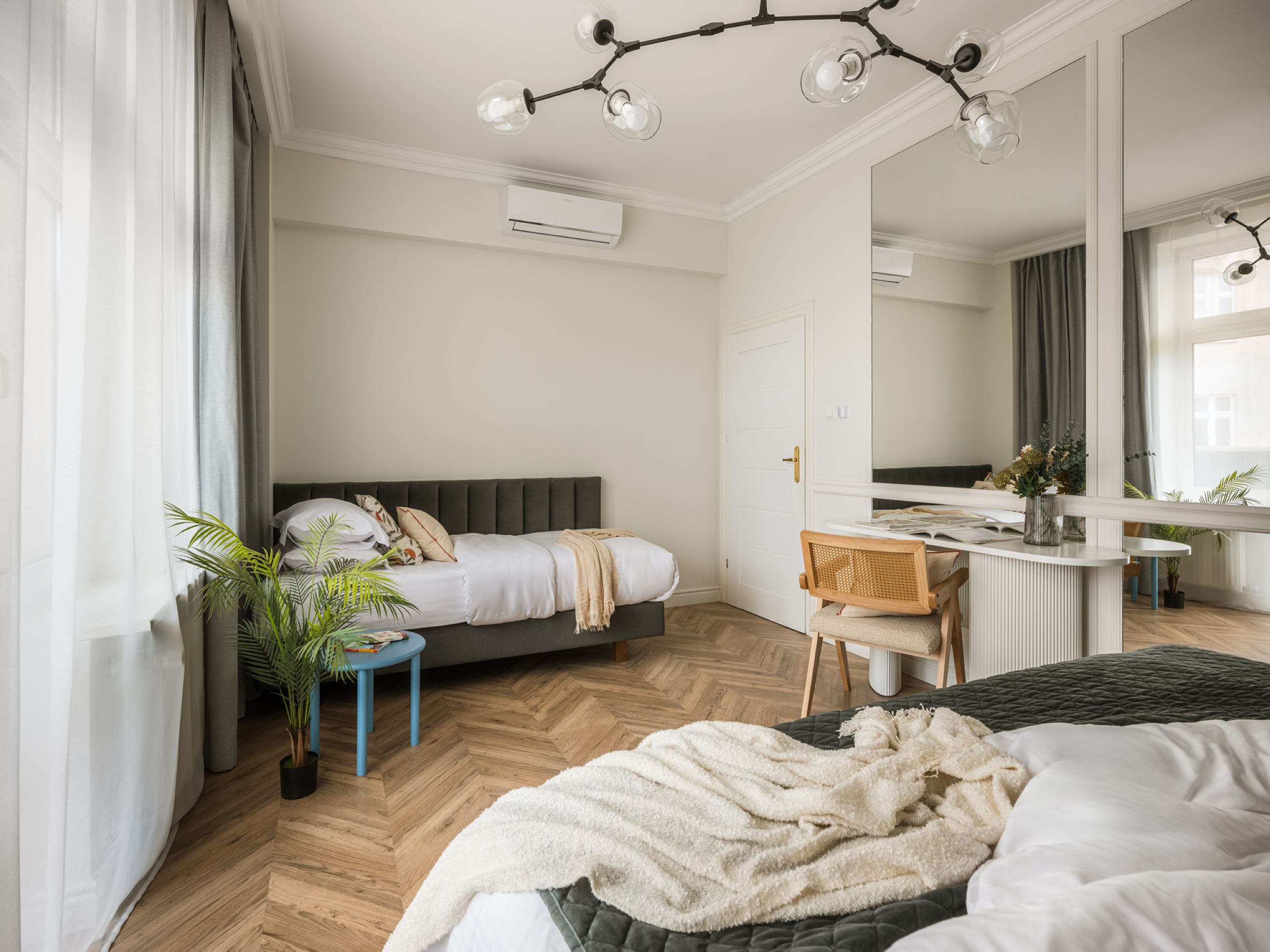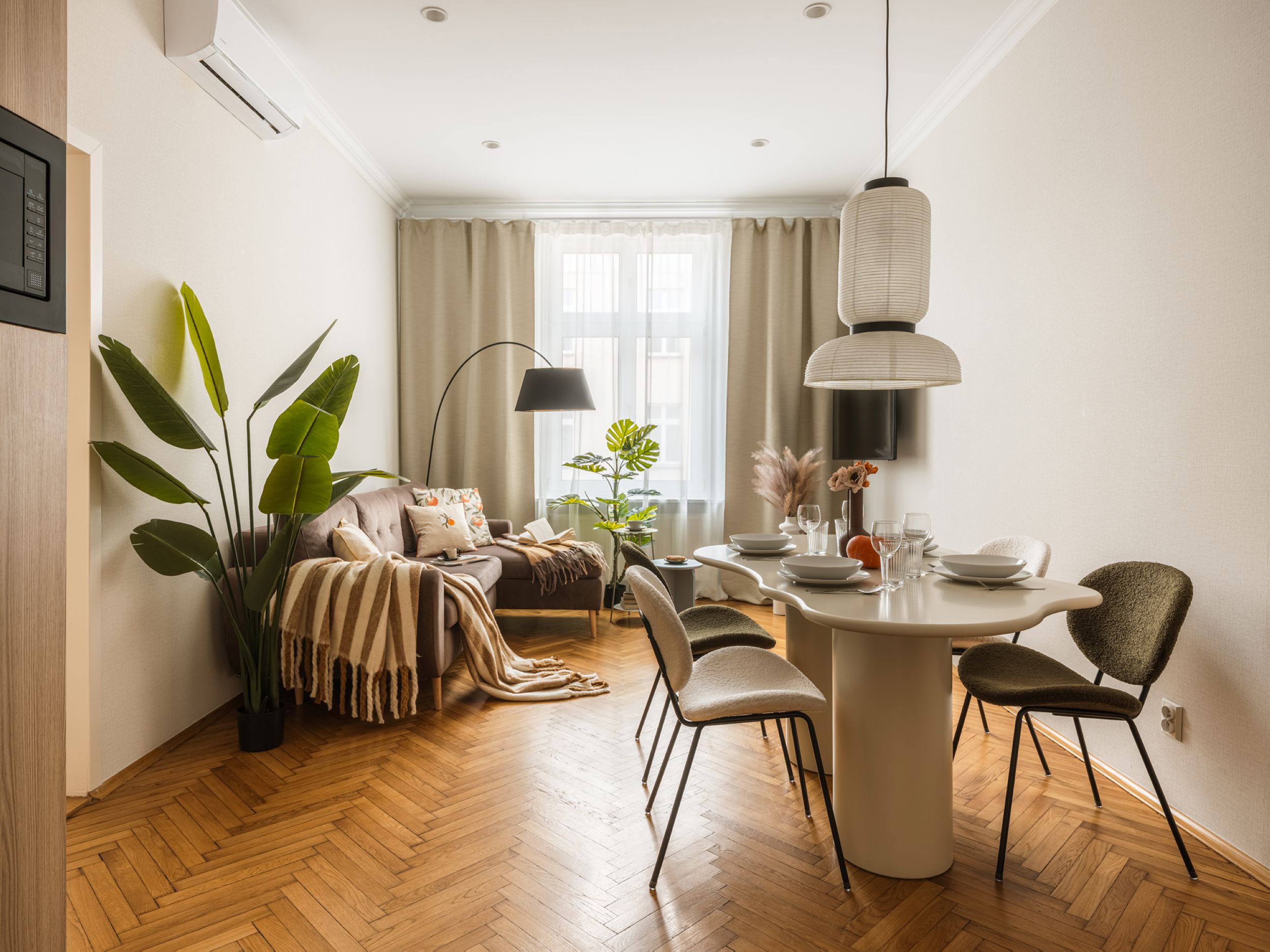 To starannie zaprojektowane, klimatyzowane mieszkanie oferuje sypialnię z łóżkiem queen-size i pojedynczym łóżkiem oraz przestrzeń dzienną z rozkładaną sofą, telewizorem Smart i stołem dla czterech osób. W pełni wyposażona kuchnia pozwala przygotowywać domowe posiłki, a łazienka z prysznicem i pralką zapewnia wygodę podczas pobytu. Szafa umożliwia wygodne przechowywanie rzeczy. Stylowe wnętrze i funkcjonalny układ tworzą przyjazną atmosferę, idealną do odpoczynku po dniu spędzonym w tętniącym życiem centrum miasta.