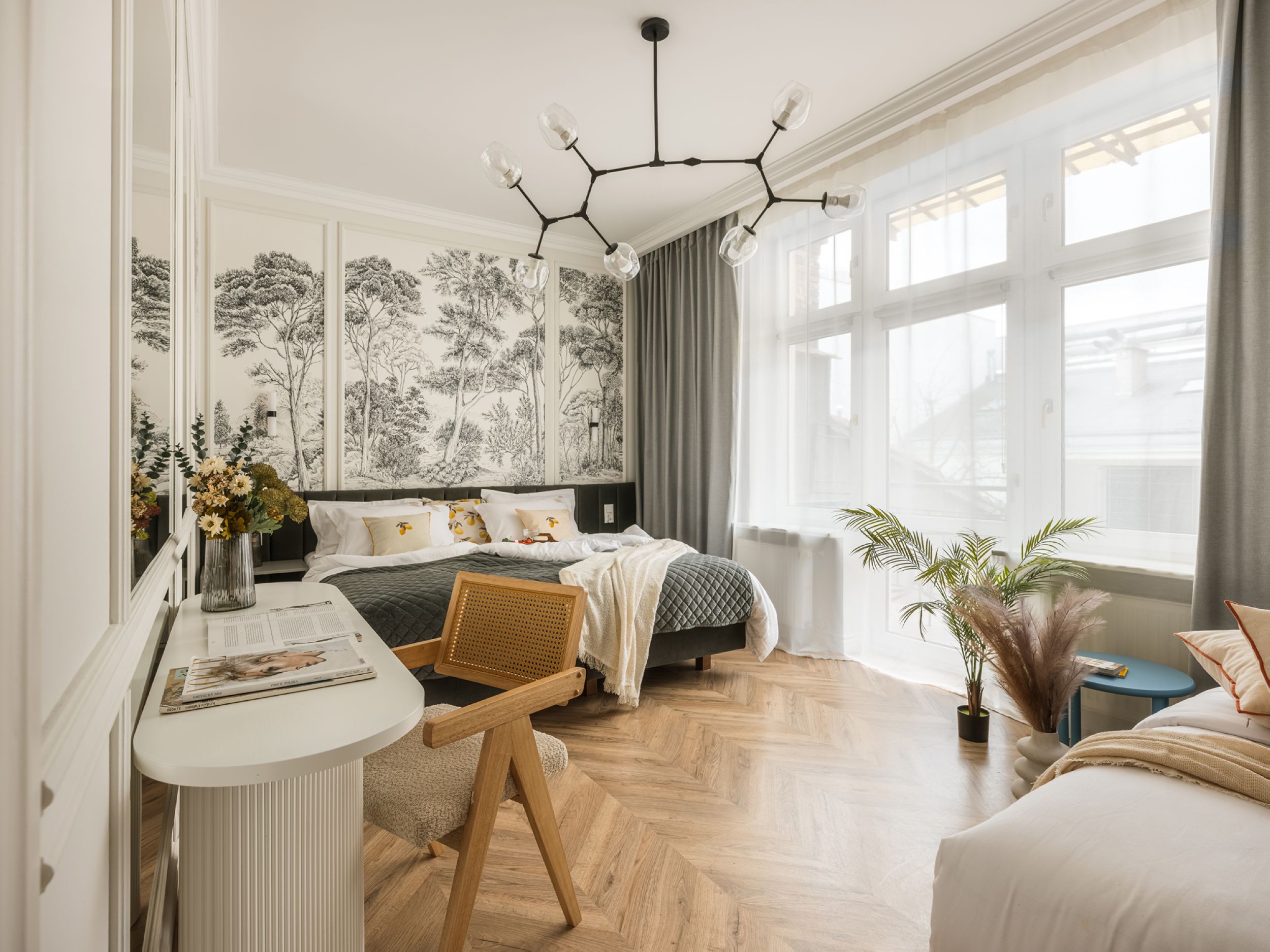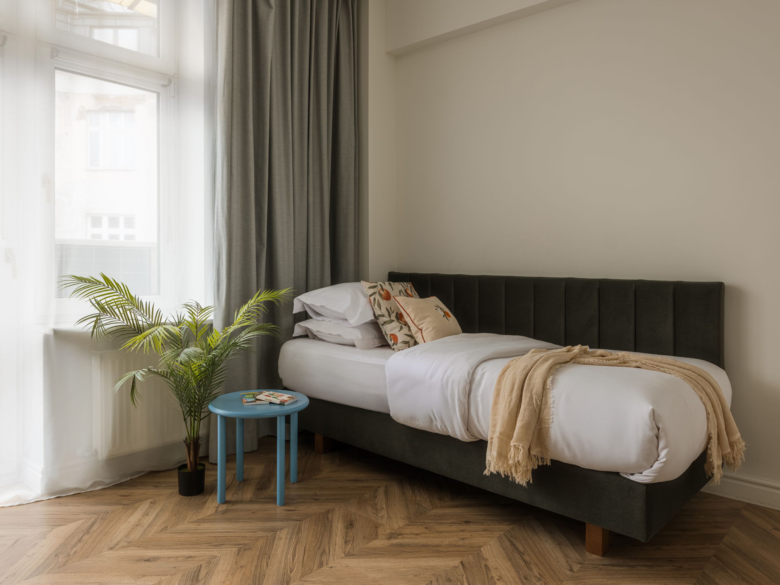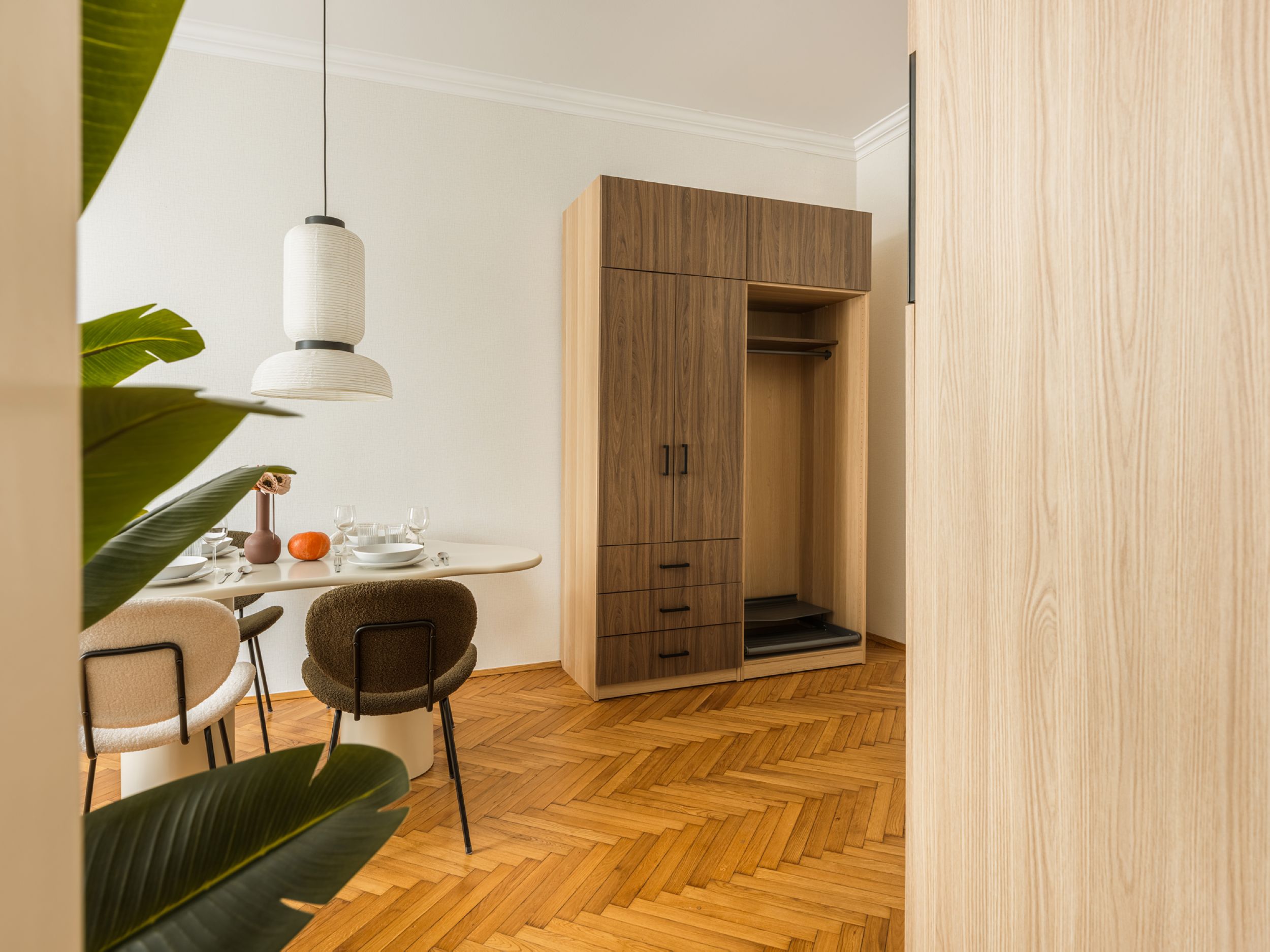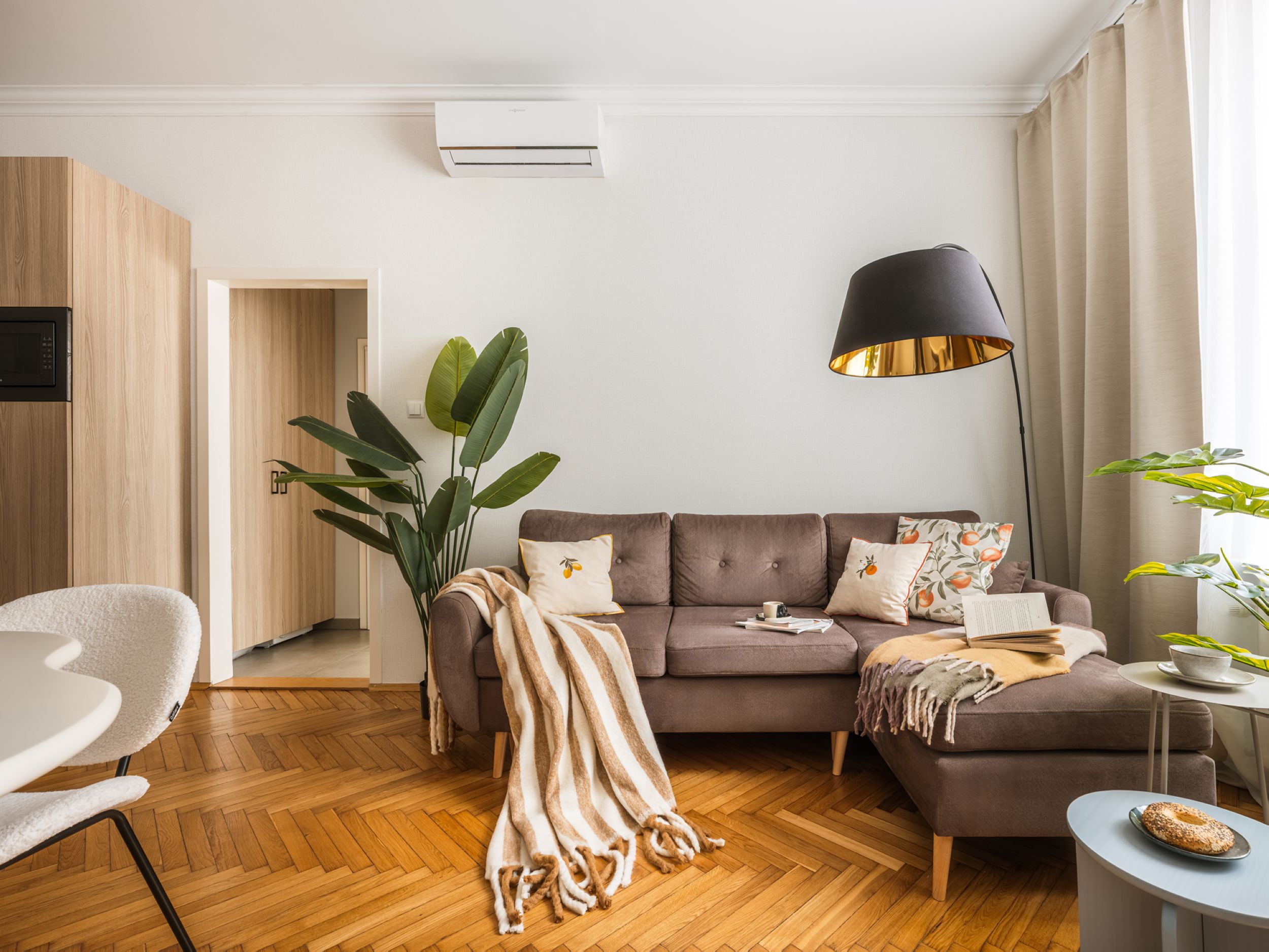 To starannie zaprojektowane, klimatyzowane mieszkanie oferuje sypialnię z łóżkiem queen-size i pojedynczym łóżkiem oraz przestrzeń dzienną z rozkładaną sofą, telewizorem Smart i stołem dla czterech osób. W pełni wyposażona kuchnia pozwala przygotowywać domowe posiłki, a łazienka z prysznicem i pralką zapewnia wygodę podczas pobytu. Szafa umożliwia wygodne przechowywanie rzeczy. Stylowe wnętrze i funkcjonalny układ tworzą przyjazną atmosferę, idealną do odpoczynku po dniu spędzonym w tętniącym życiem centrum miasta.