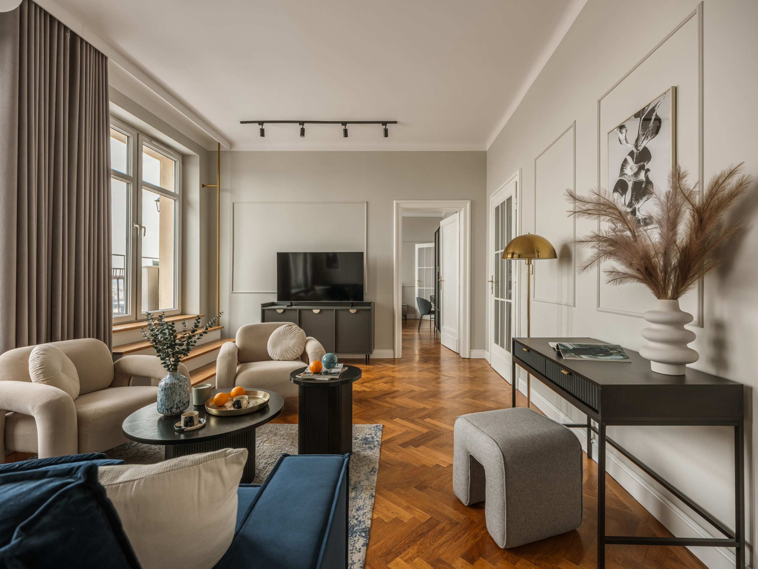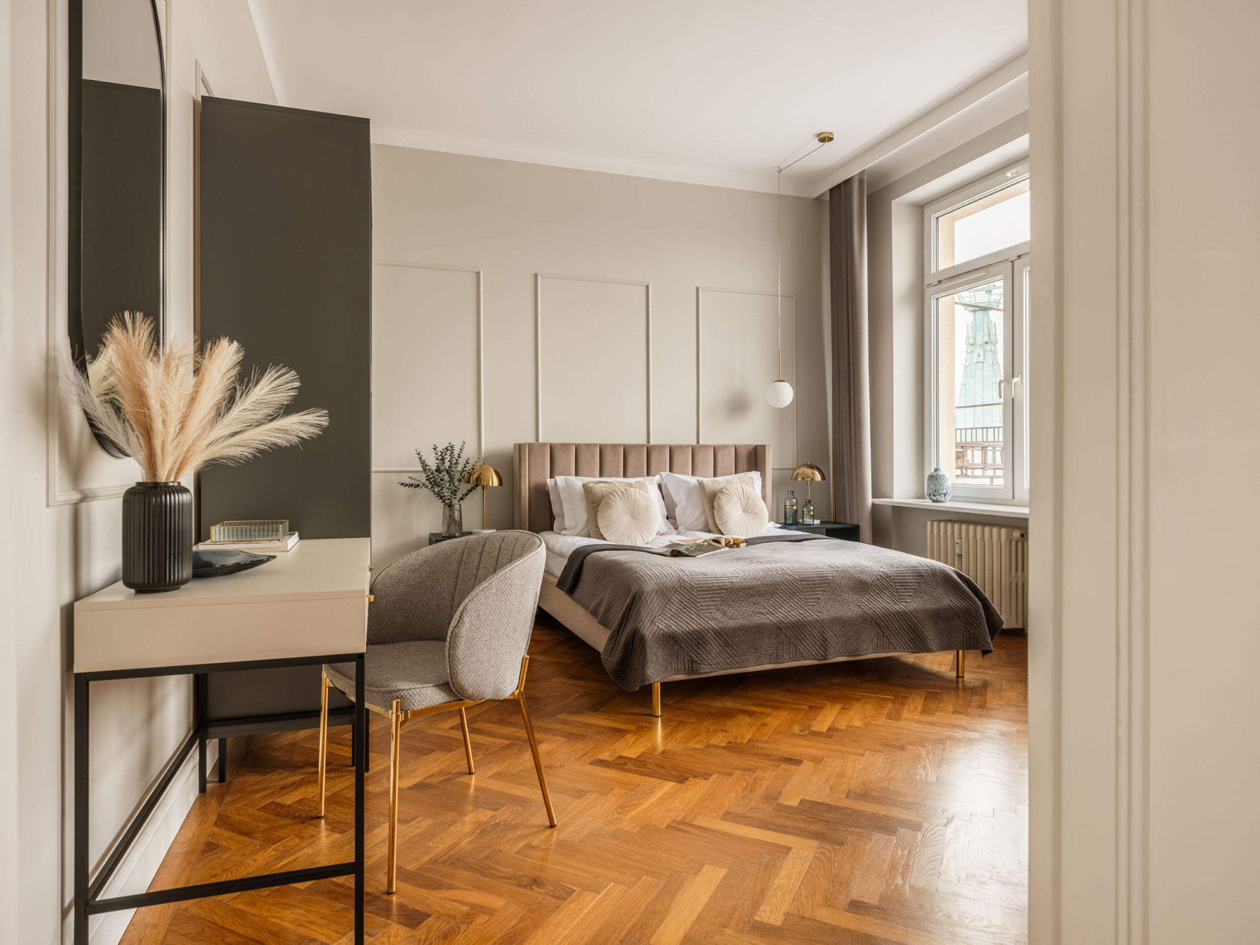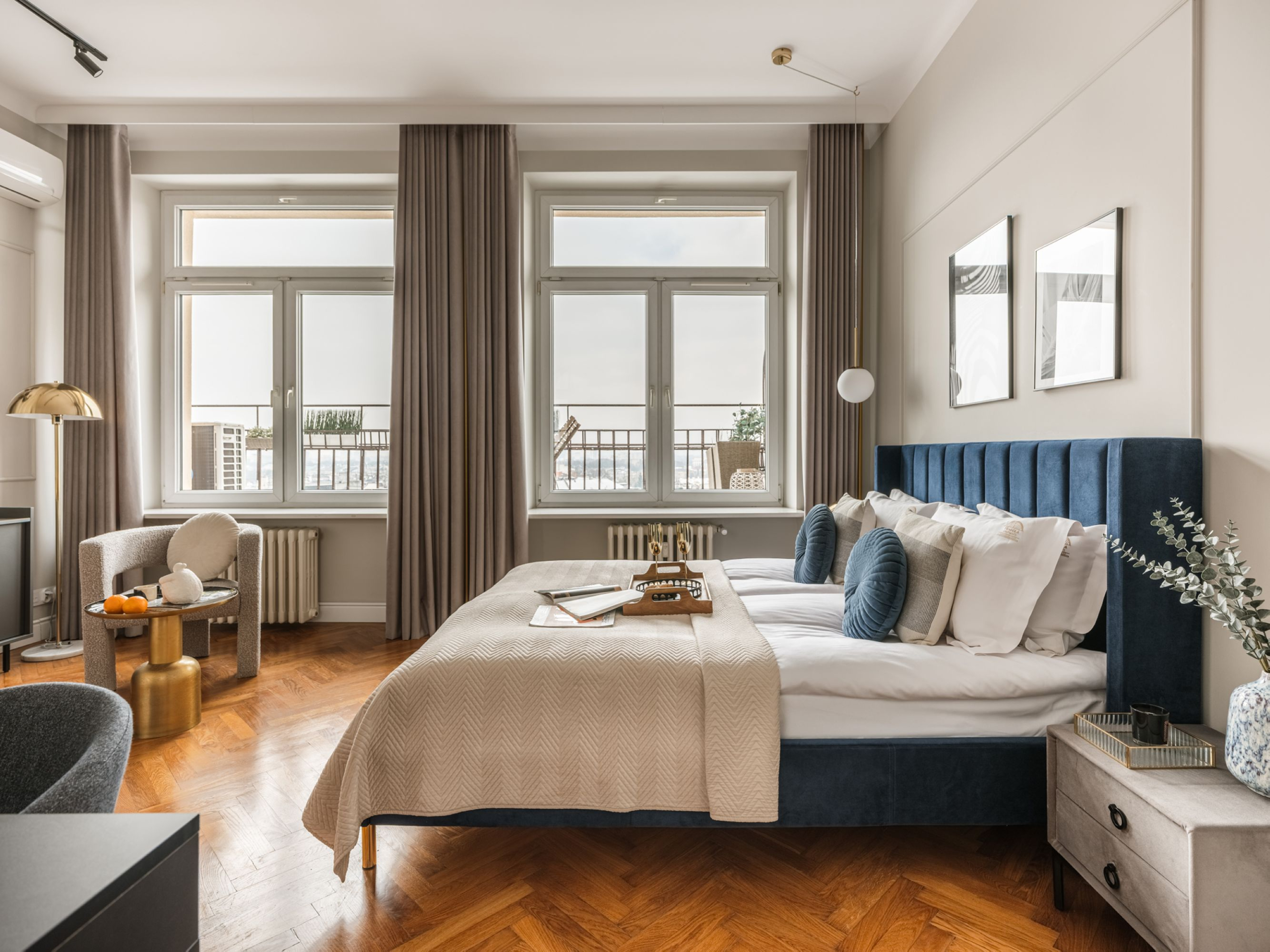 Podziwiaj zapierające dech w piersiach zachody słońca z tego wyjątkowego apartamentu z dwiema sypialniami, z którego roztacza się widok na charakterystyczne dachy Krakowa. Ciesz się rozległą panoramą Królewskiego Miasta, relaksując się w jasnej, komfortowej i starannie zaprojektowanej przestrzeni.